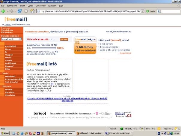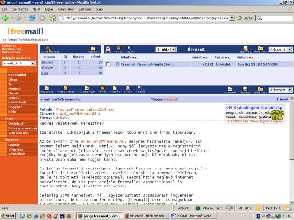Az első levél a rendszer üdvözletét tolmácsolja. Ezzel a freemail cím már kész is.