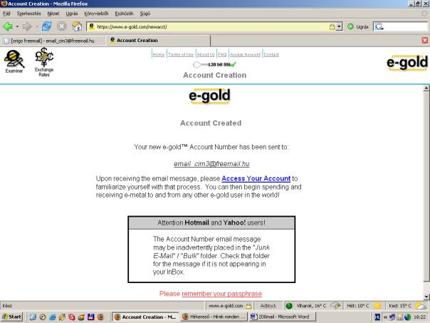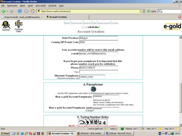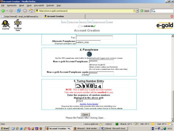 New e-gold Account Passphrase: ide írd a választani kívánt jelszódat (muszáj